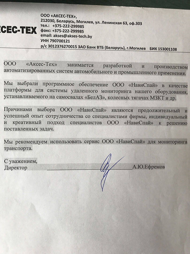 “ООО «Аксес-Тех» занимается разработкой и производством автоматизированных систем автомобильного и промышленного применения. Мы выбрали программное обеспечение ООО «НавиСпай» в качестве платформы для системы удалённого мониторинга нашего оборудования, устанавливаемого на самосвалах «БелАЗ», колёсных тягачах МЗКТ и др. Причинами выбора ООО «НавиСпай» являются продолжительный и успешный опыт сотрудничества со специалистами фирмы, индивидуальный и креативный подход специалистов ООО «НавиСпай» к решению поставленных задач. Мы рекомендуем использовать сервис ООО «НавиСпай» для мониторинга транспорта.”